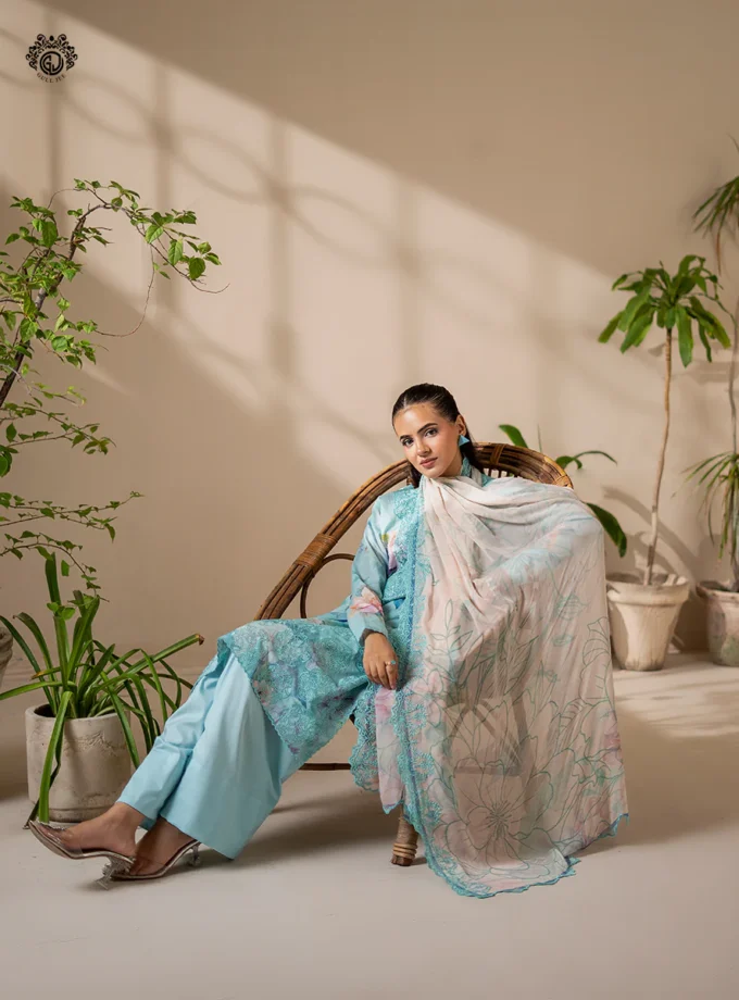 Unstitched 3Pc Embroidered Lawn Dress Moonlit Blue Farasha Aurea