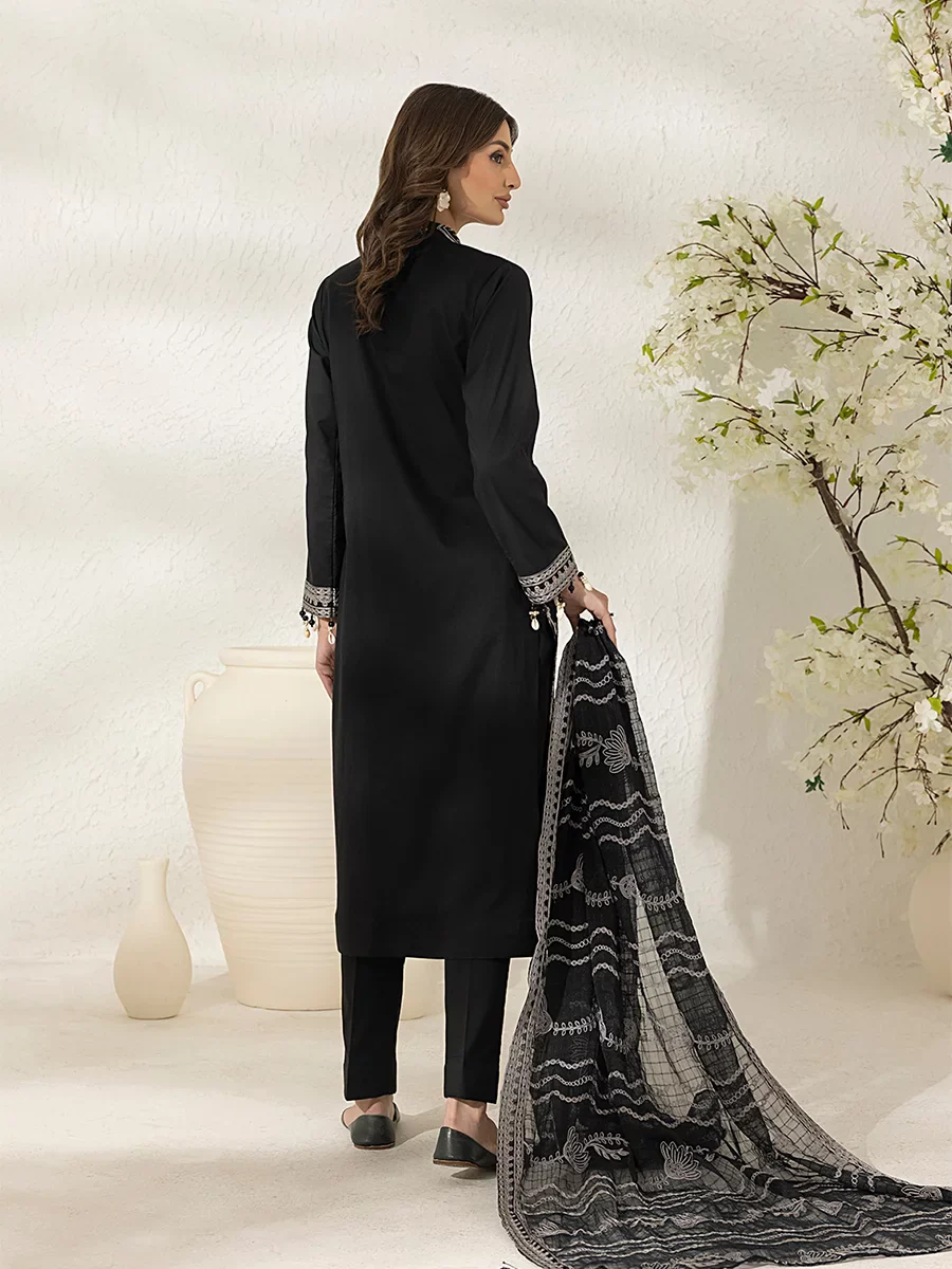 | Unstitched 3 Piece Embroidered Cambric Dress With Chiffon Check Embroidered Dupatta-Salitex Monochrome |
