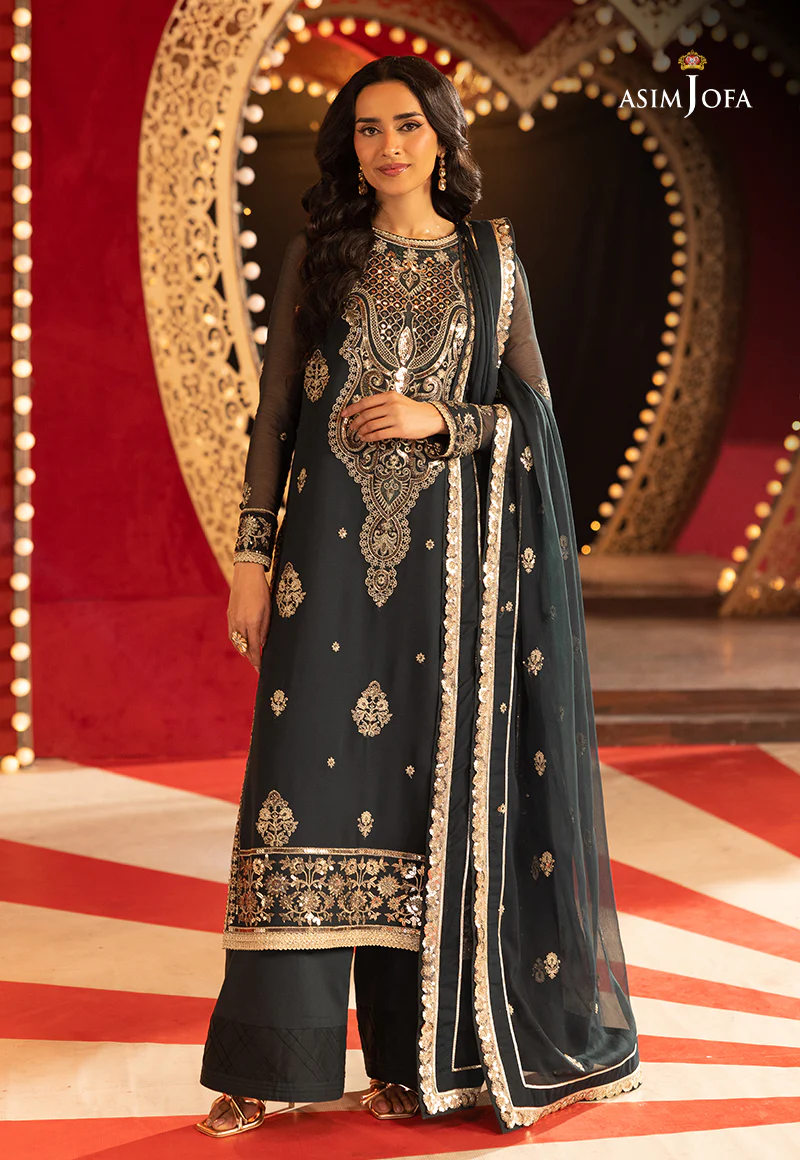 | Unstitched 3 Piece Zari and Sequin Embroidered Crinkle Chiffon Dress With Embroidered Chiffon Dupatta Asim Jofa |