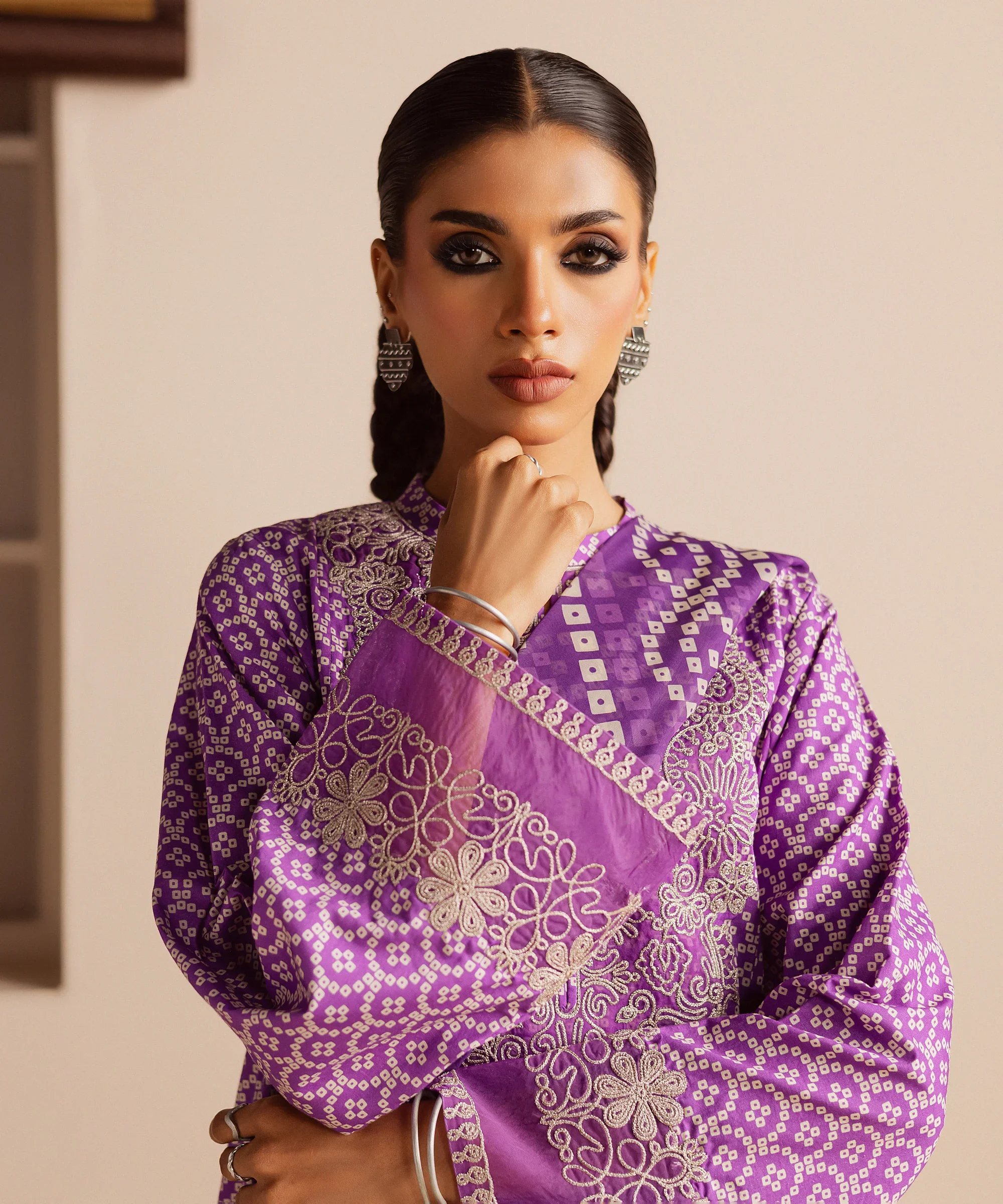 Unstitched 3 Piece Embroidered Purple Dobby Dress With Printed Blended Chiffon Dupatta by Sapphire. |