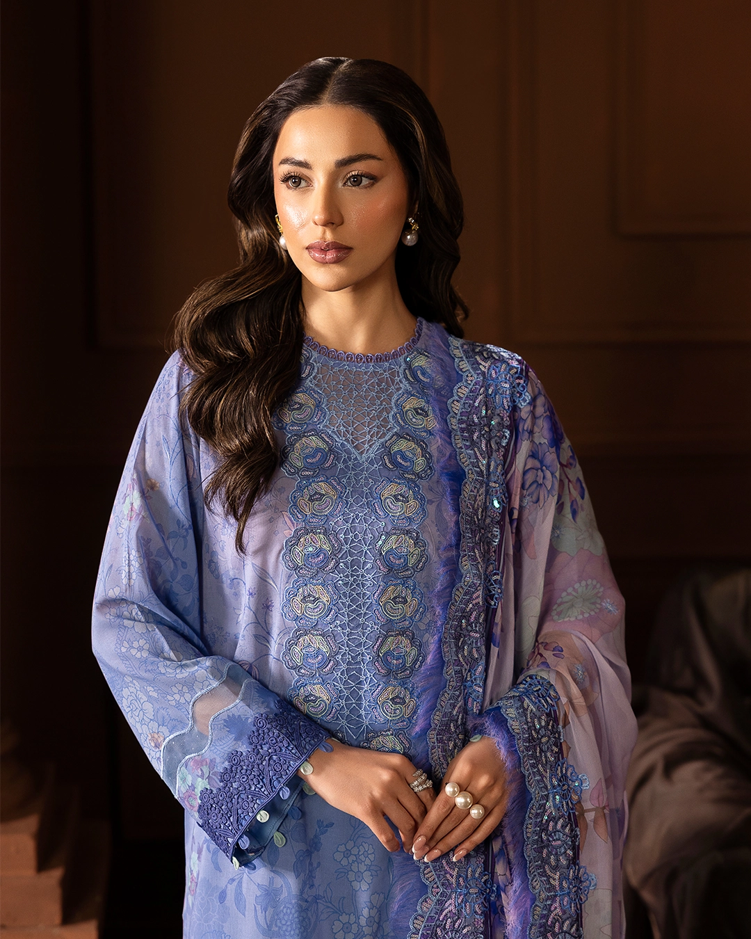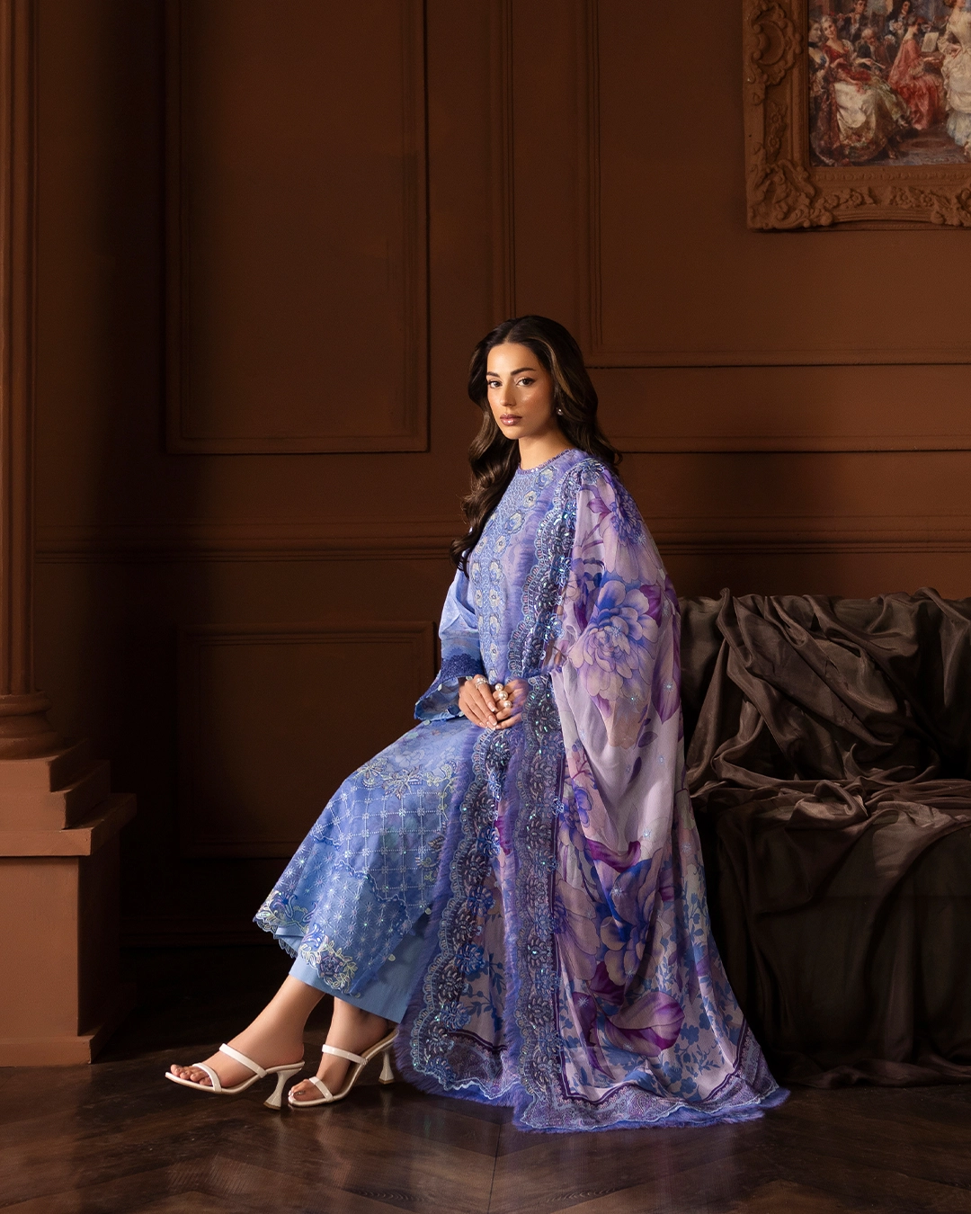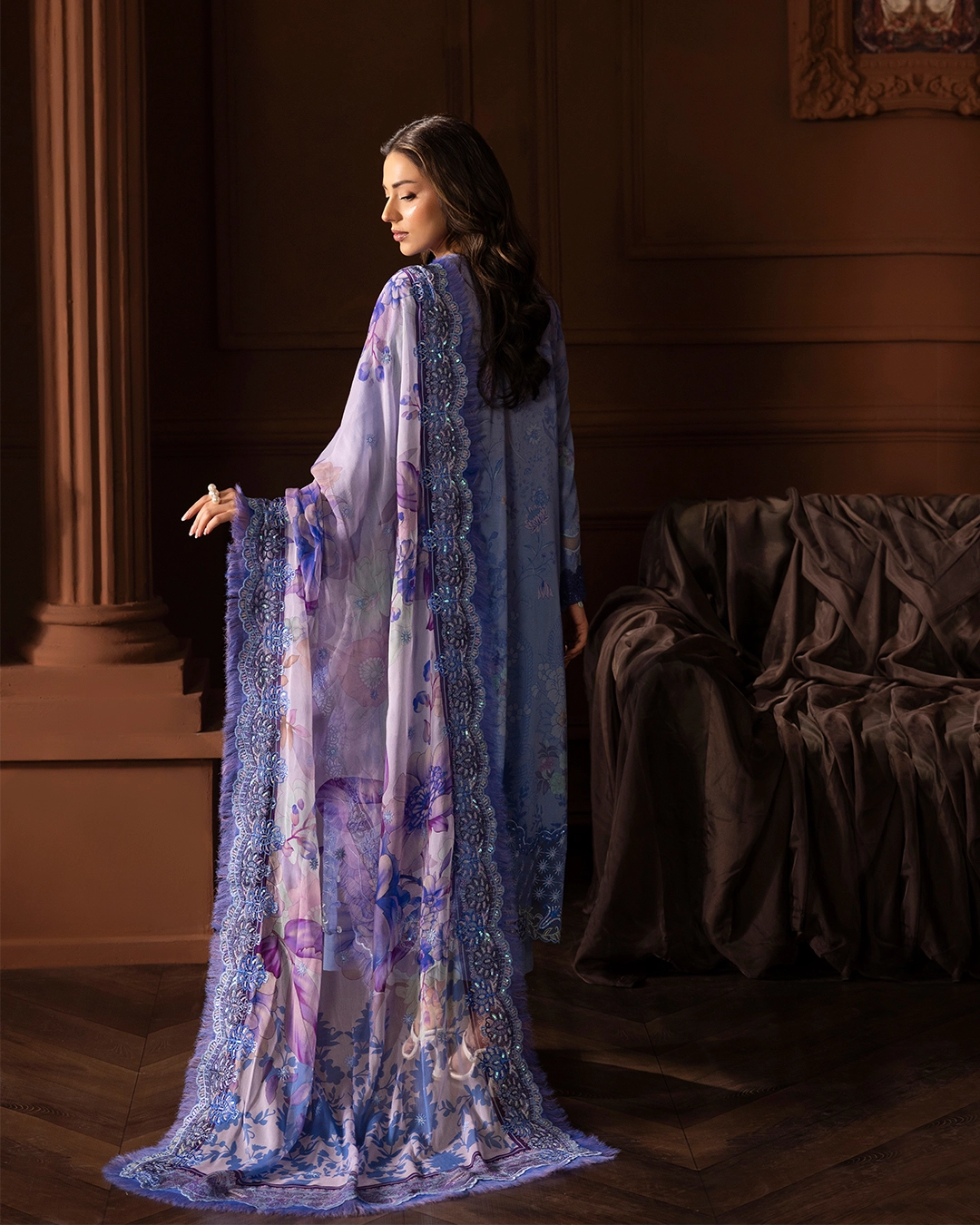 | Digital Printed Bamber Chiffon Sequin Embroidered Cutwork ( 2 sides ) Dupatta |