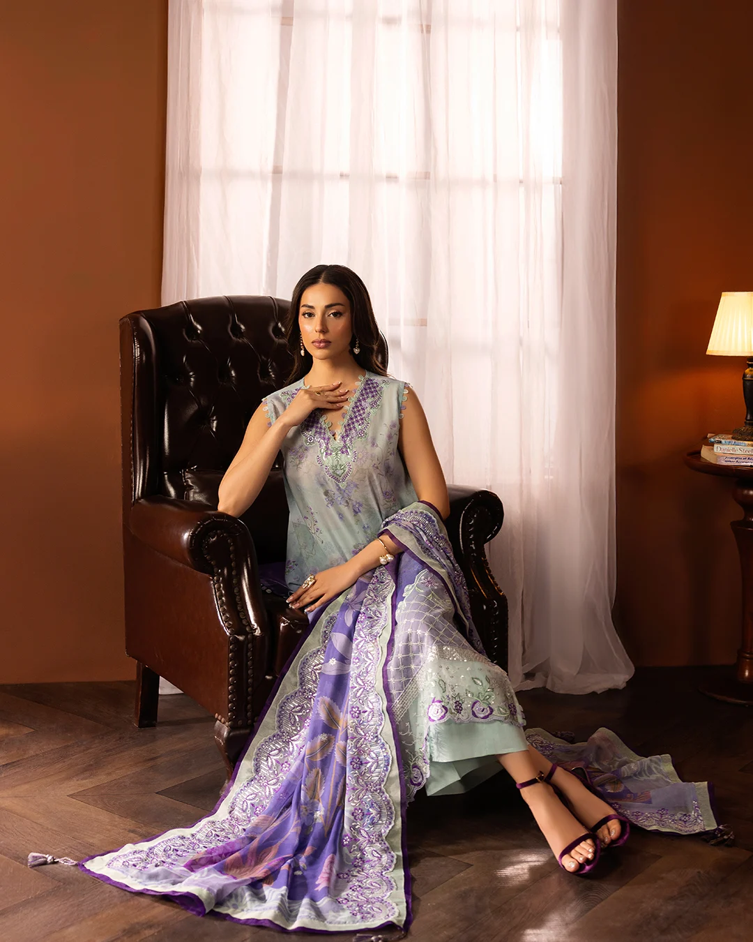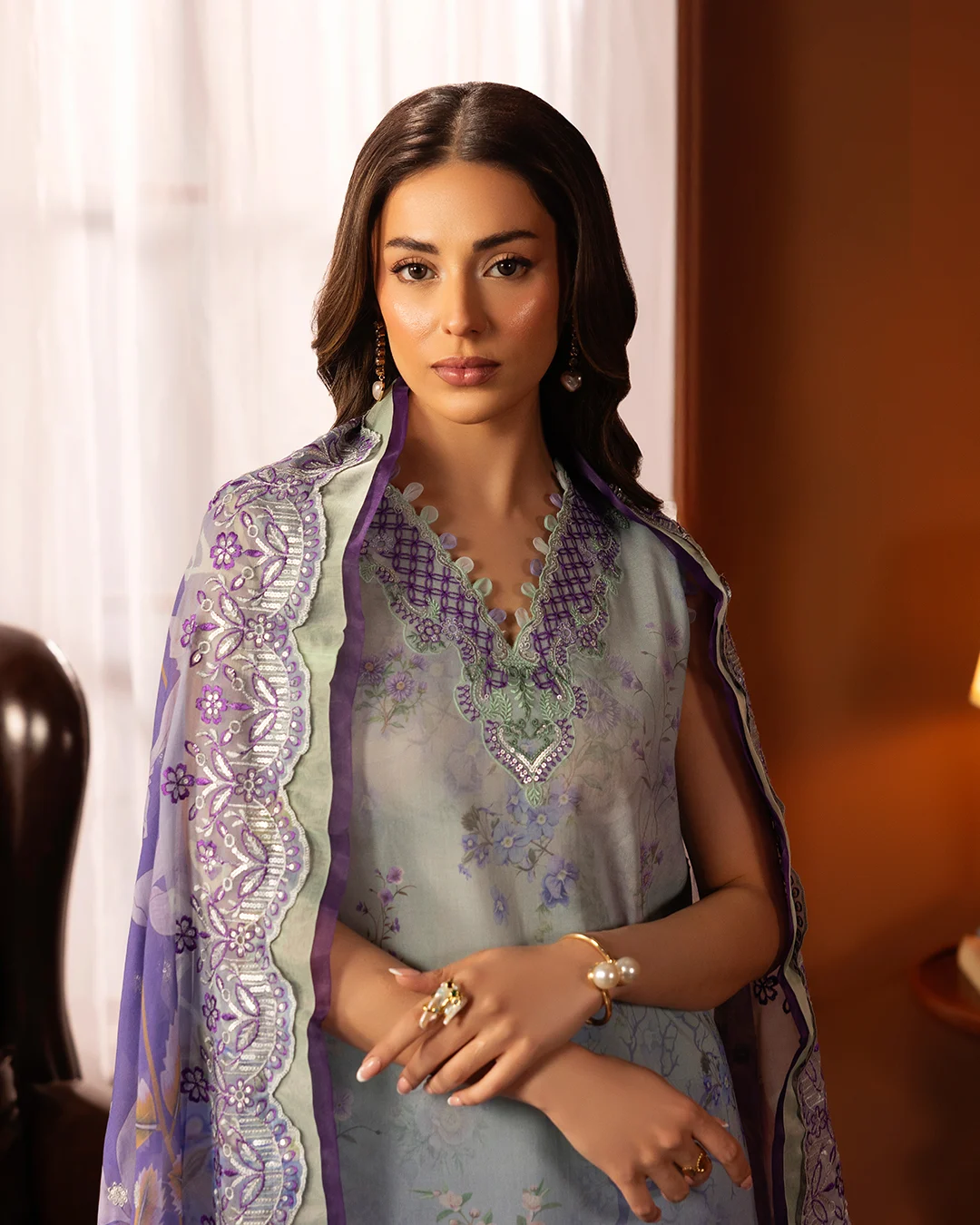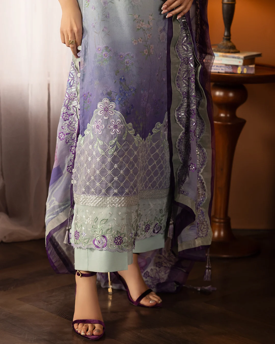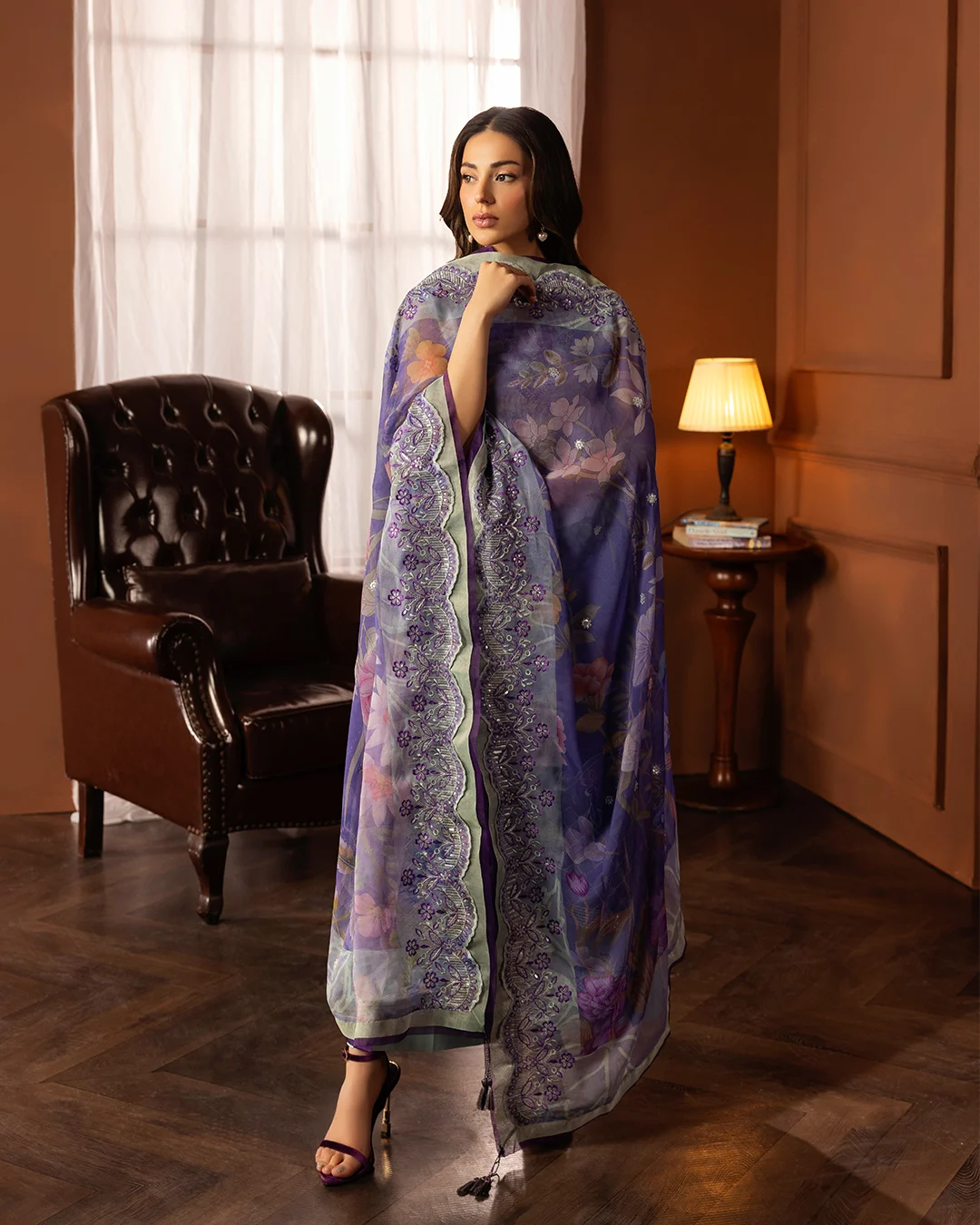Digital Printed Bamber Chiffon Sequin Embroidered Cutwork ( 2 sides ) Dupatta