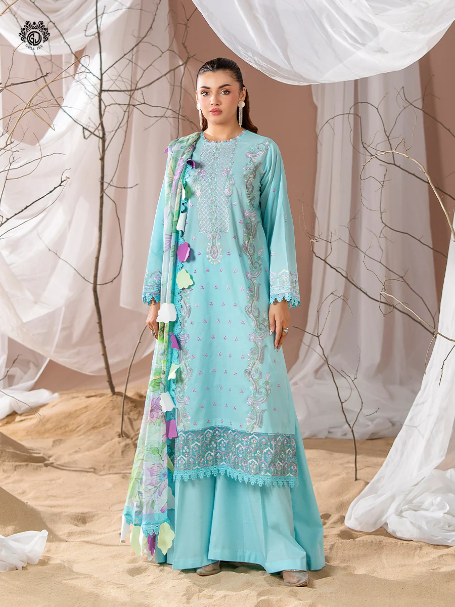 | Unstitched 3 Piece Exclusive Embroidered Lawn Dress With Chiffon Dupatta GullJee Rang E Sahar |