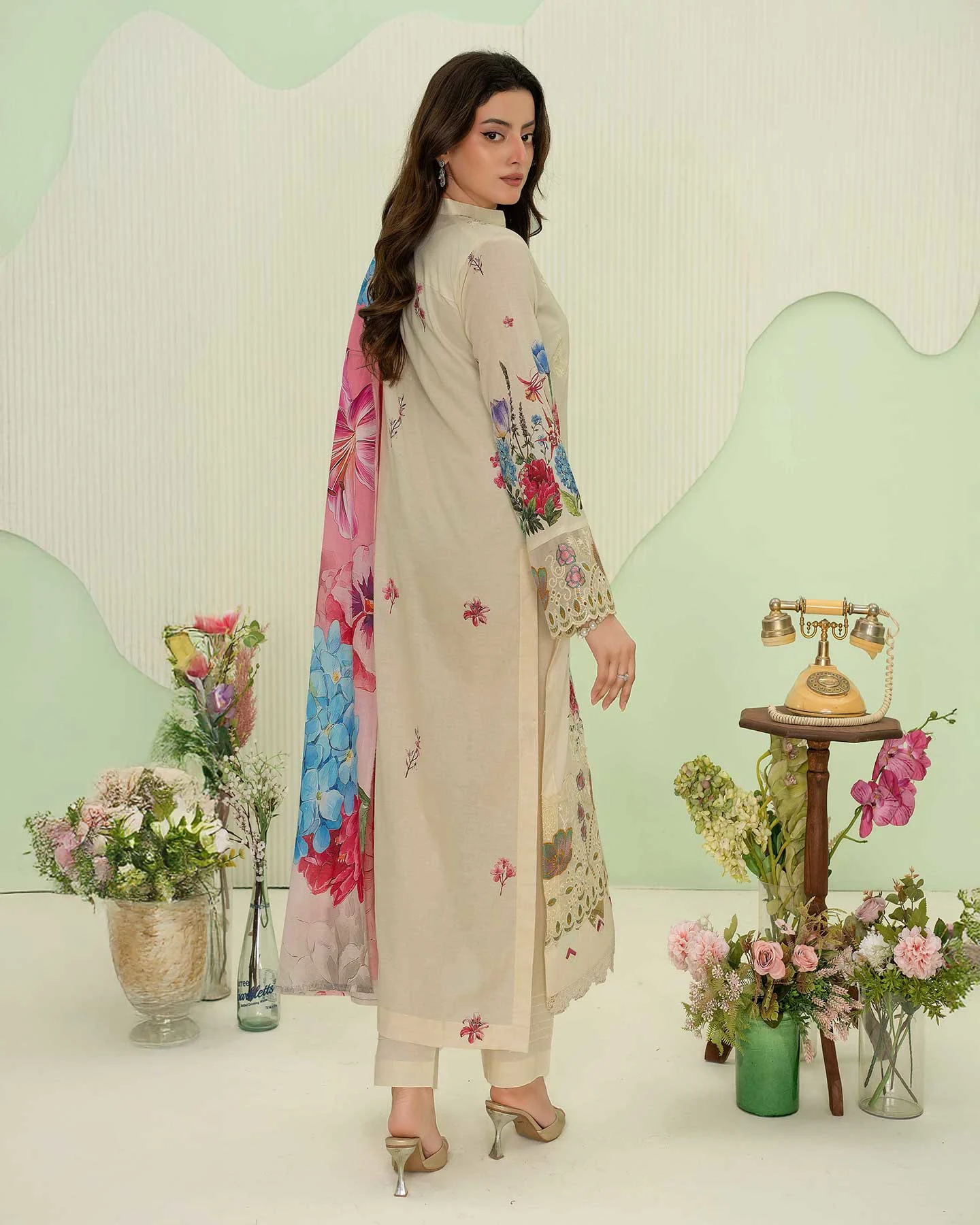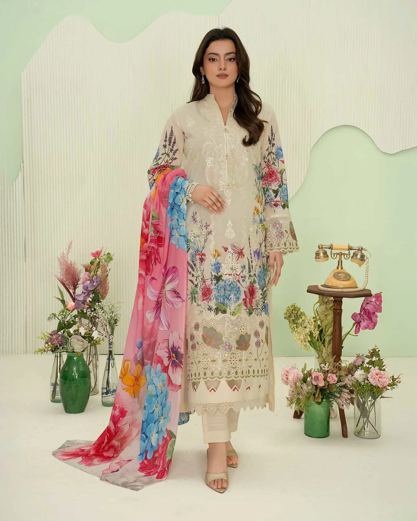 | Unstitched 3 Piece Premium Embroidered Lawn Dress With Digital Printed Voile Dupatta Aalaya Signature |