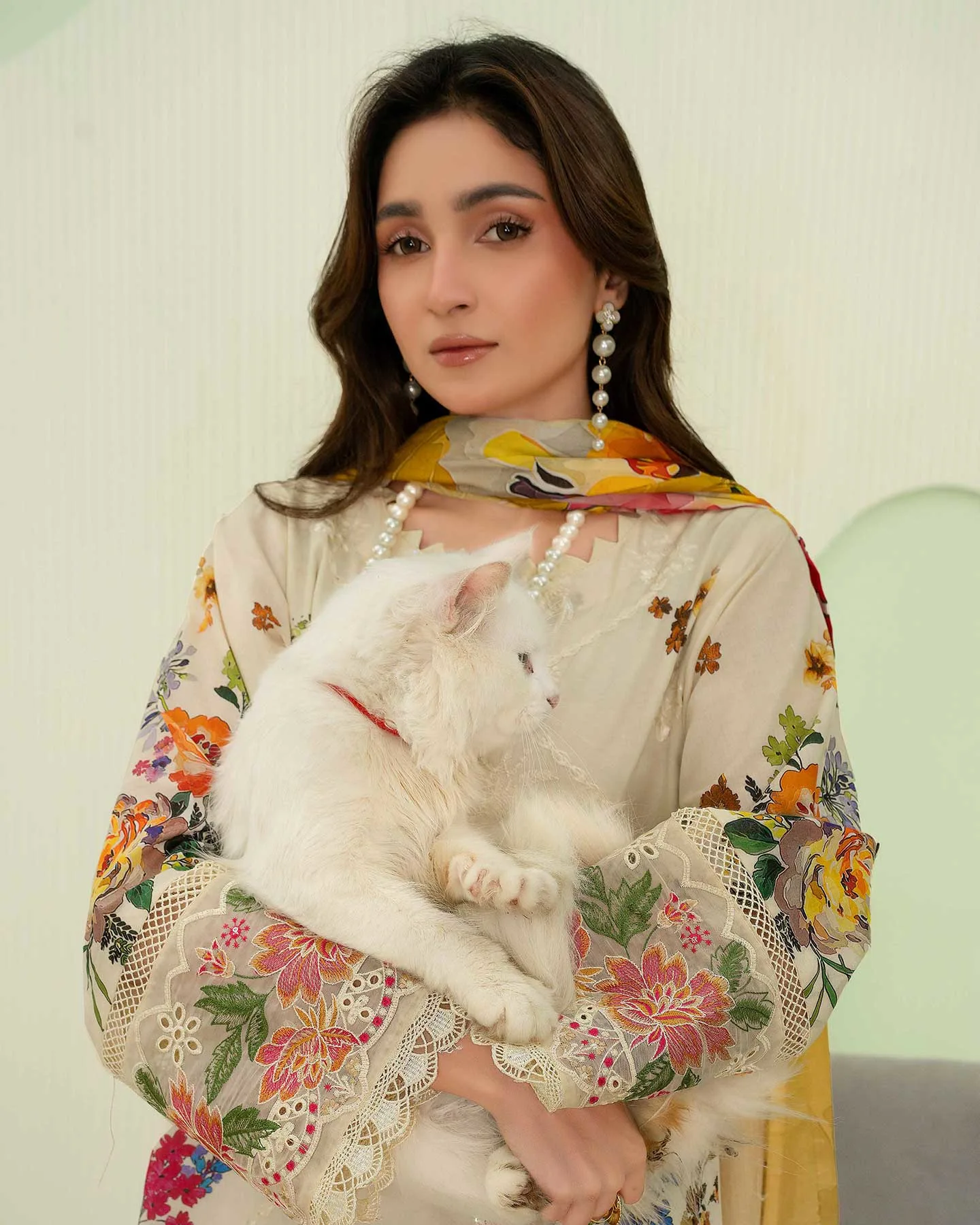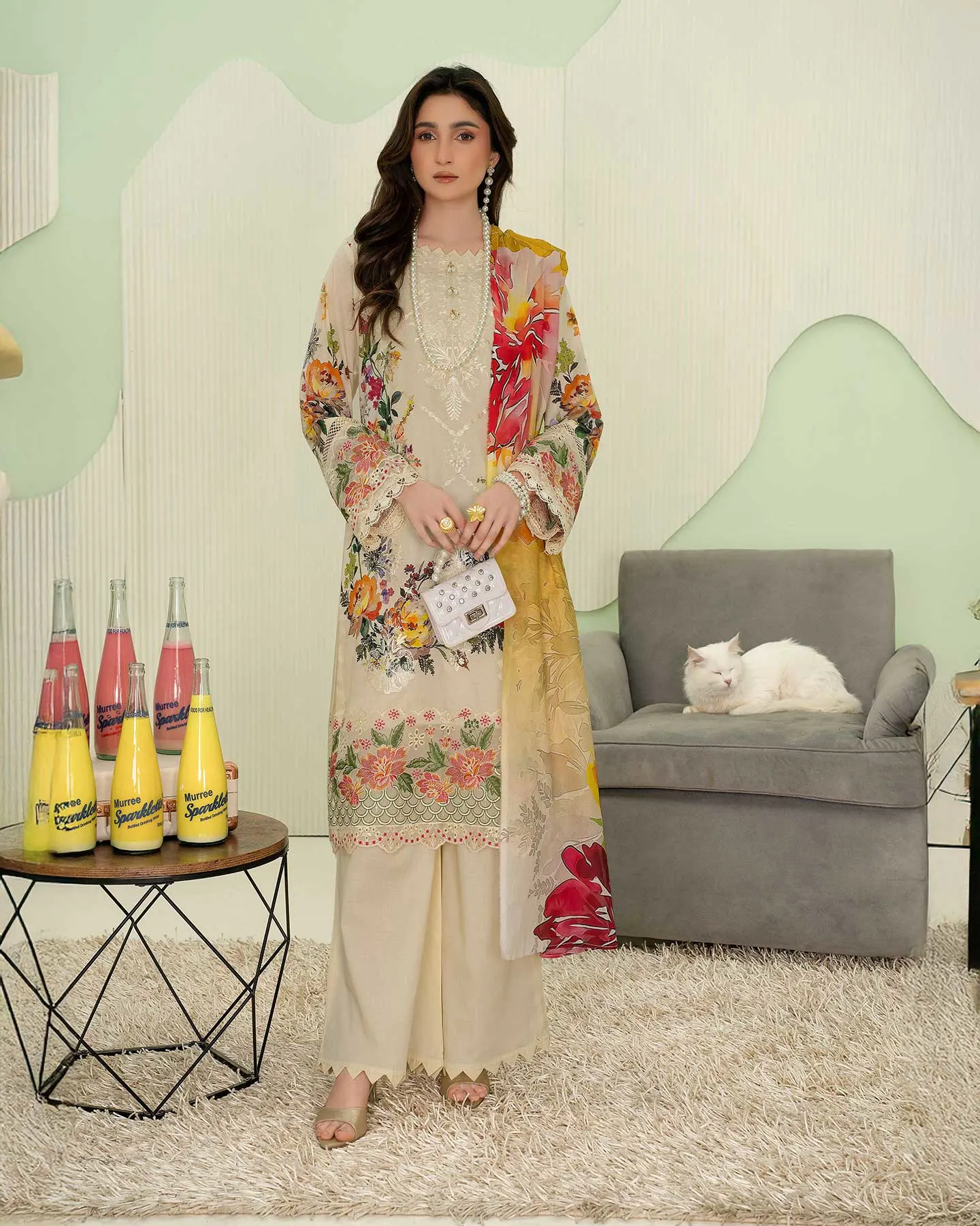 | Unstitched 3 Piece Premium Embroidered Lawn Dress With Digital Printed Voile Dupatta Aalaya Signature |