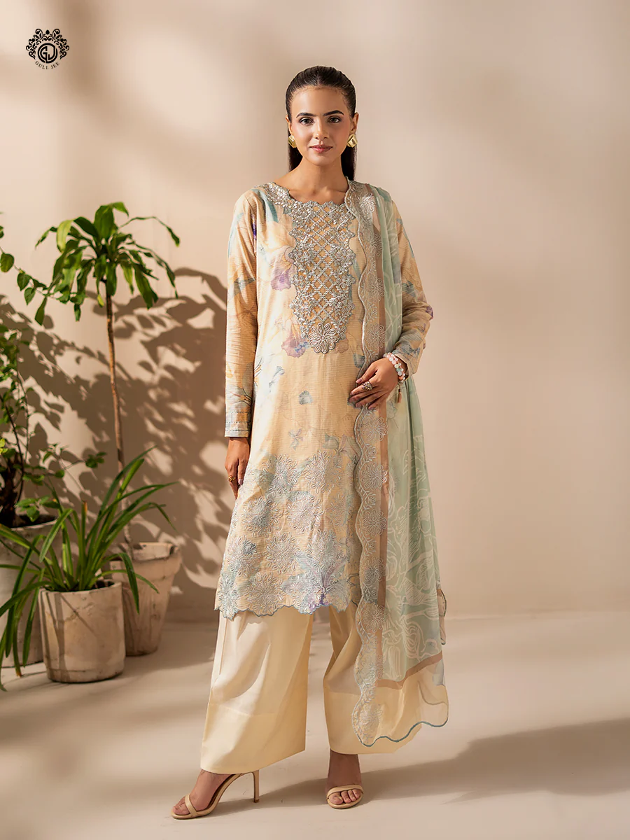 | Unstitched 3 Piece Printed Embroidered Lawn Dress With Bamber Chiffon Cutwork Dupatta. Rang Pasand Volume 15 by GullJee. |