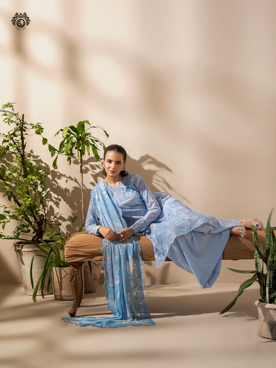 | Unstitched 3 Piece Printed Embroidered Lawn Dress With Bamber Chiffon Cutwork Dupatta. Rang Pasand Volume 15 by GullJee. |